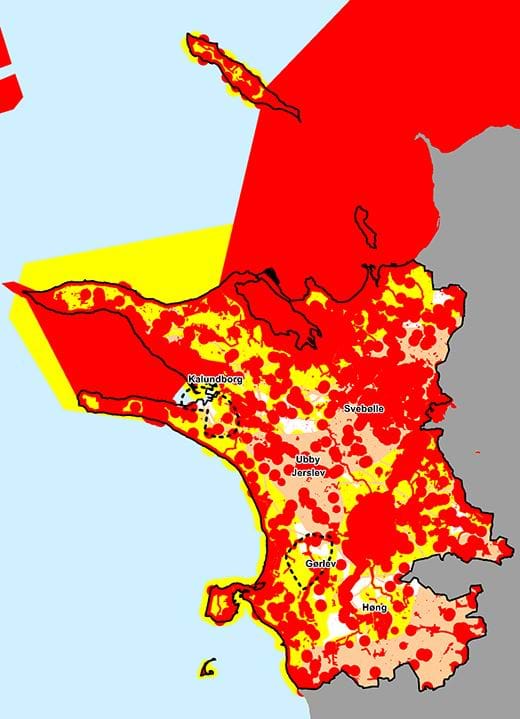Kort 8.24.b Planmæssige bindinger for placering af større fælles biogasanlæg. Rød: restriktive zoner, orange: vurderingszoner anden myndighed, gul: vurderingszone kommunen.