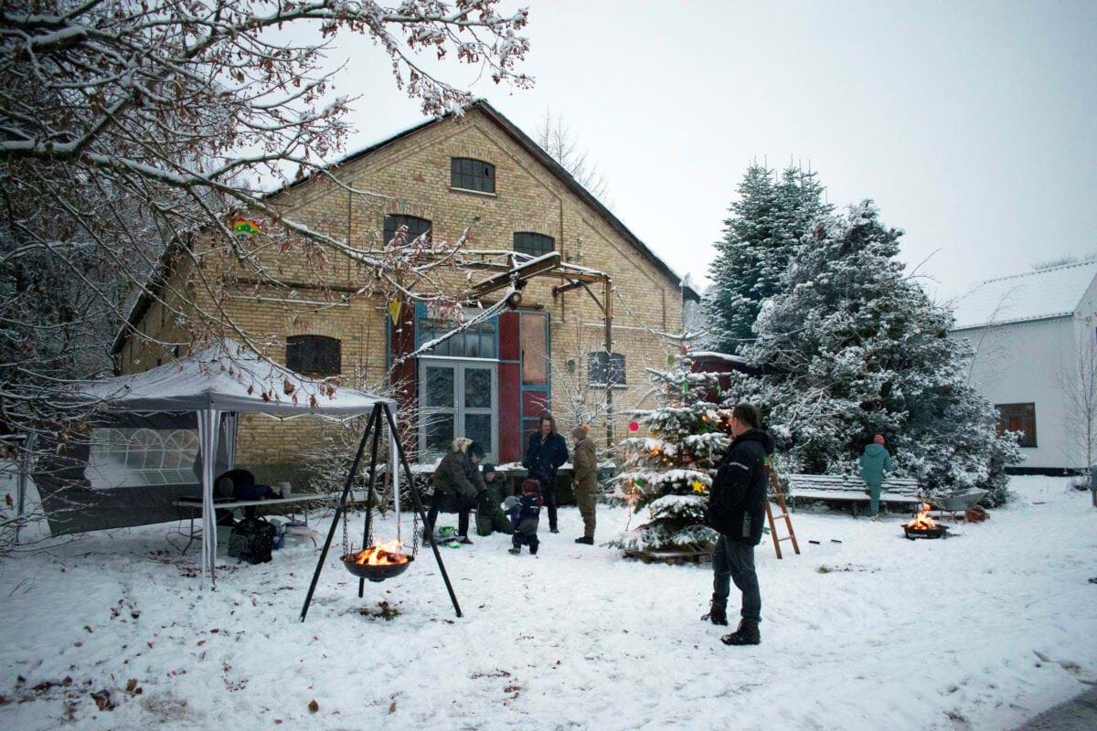 Billede af event i Bjergsted, hvor det tidligere kornmagasin danner rammen. Der er givet byfornyelsesmidler til at omdanne bygningen til et fælleshus. Fotograf Peer Freiesleben.